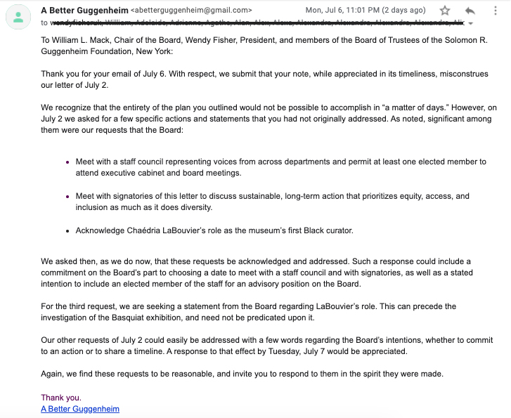 A Better Guggenheim responds to the Board to highlight points of urgent concern that the letter dated July 1 did not address. The original staff letter is reopened to allow for additional signatures.